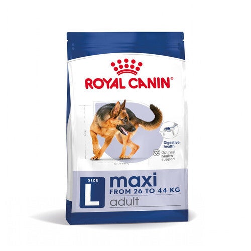 Royal Canin Maxi Adult is hondenvoer voor grote honden vanaf 15 maanden tot 5 jaar met een volwassen gewicht tussen 25 en 45 kilogram.
