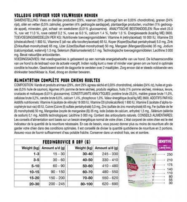 Vlees en dierlijke producten (29%, waarvan 29% gedroogd lam en 0,03% chondroïtine), granen (24% rijst), oliën en vetten (0,5% zalmolie), groenten (4% gedroogde aardappel), plantaardige producten, vruchten (1% gedroogde appel), mineralen, gist, schaal- en weekdieren (0,01% glucosamine).