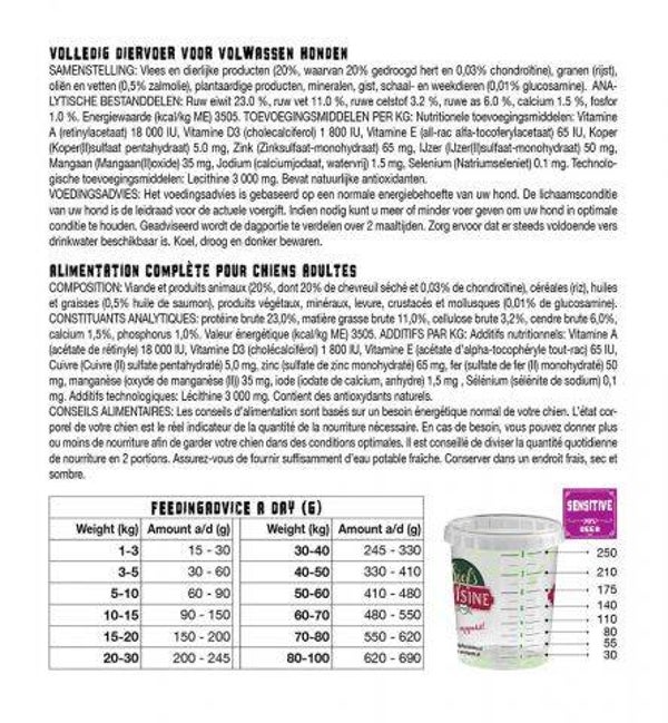 Vlees en dierlijke producten (20%, waarvan 20% gedroogd hert en 0,03% chondroïtine), granen (rijst), oliën en vetten (0,5% zalmolie), plantaardige producten, mineralen, gist, schaal- en weekdieren (0,01% glucosamine).
