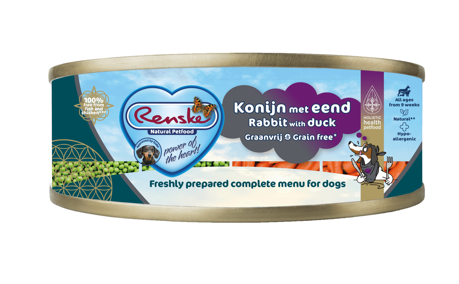 Renske Vers Bereide Vlees Maaltijd konijn met eend is een complete, graanvrije maaltijd voor jonge en volwassen honden van alle rassen vanaf 9 weken.