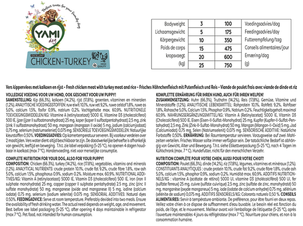 Kip (66,3%), Kalkoen (14,2% ), granen (rijst 17,8%), vitaminen en mineralen.