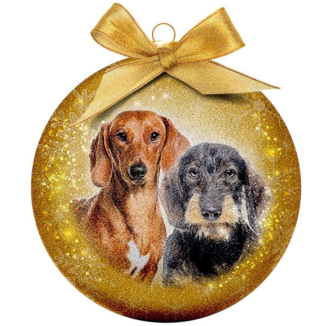 De Plenty Gifts Kerstbal Frosted Dachshund Geel zijn sfeervolle kerstballen voor in de kerstboom of ter decoratie in huis, met de afdruk van een hond, gemaakt van kunststof en onbreekbaar.
