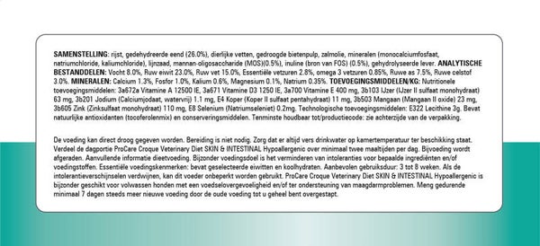 ProCare Croque Veterinary Skin Support is een krokante dieetvoeding voor volwassen honden met huidproblemen door voedselovergevoeligheid en/of omgevingsallergie. Deze volledige dieetvoeding helpt de conditie van de gevoelige huid te verbeteren.