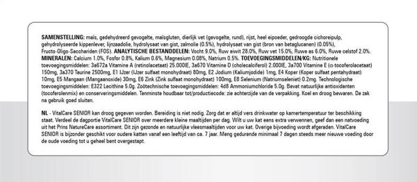 VitalCare Senior is een krokante voeding geschikt voor katten met een leeftijd vanaf ca. 8 jaar. Deze volledige voeding sluit aan bij de veranderende voedingsbehoefte van de oudere kat en ondersteunt het immuunsysteem en de gewrichten. Verlaagd fosforgehalte helpt de nieren te ontlasten. Met VitalCare Senior kunt u uw kat ook in de seniorfase optimaal ondersteunen.