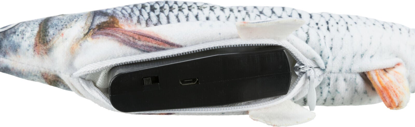 De Trixie Spartel Vis Met Catnip Van Stof 30 cm is bewegend kattenspeelgoed in de vorm van een vis, met belletje en kattenkruid en eenvoudig op te laden door middel van USB.