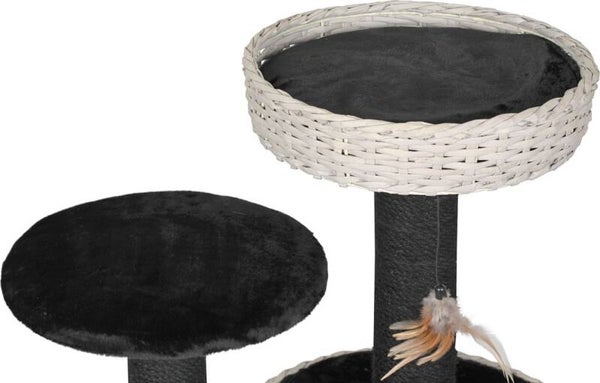 Krabpaal Geweven Met 2 Zitjes Zwart / WitDeze stevige, geweven krabpaal is multifunctioneel. Onderin het meubel zit een huisje waar de kat zich lekker kan verschuilen. Hierboven zijn twee plateaus op verschillende hoogtes waar de kat of kitten op kan liggen of spelen met één van de twee hangende speeltjes.