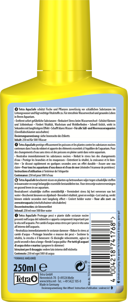 Tetra AquaSafe maakt leidingwater visvriendelijk en beschermt vissen en planten op betrouwbare wijze tegen schadelijke stoffen in het water. De geoptimaliseerde vitamine B-mix vermindert stress bij vissen tijdens waterverversingen nu nog beter en legt zo de basis voor gezond leven in een aquarium.