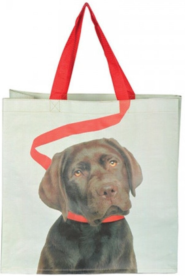 Deze hond mag in de winkels wel naar binnen. Netjes aan de riem is de hond een goede begeleider en is hij de baas over de inhoud in deze ruime boodschappentas.
