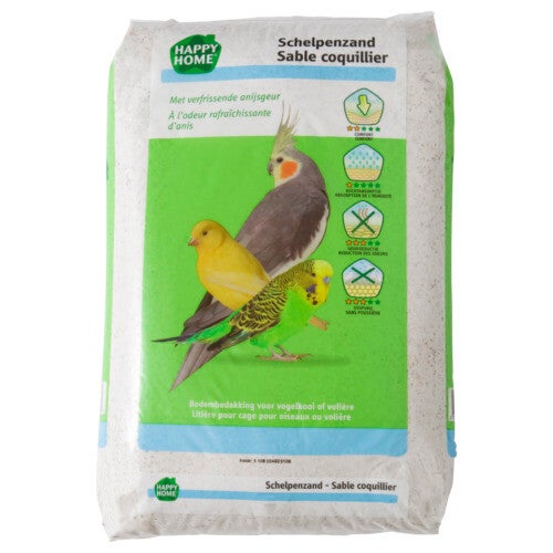 Schelpenzand is onmisbaar in iedere vogelkooi, het bevordert namelijk de hygiëne. Happy Home Schelpenzand is een mengeling van gezuiverd wit zand met oester- en zeeschelpjes. Ook is er anijs toegevoegd voor een lekkere, frisse geur.