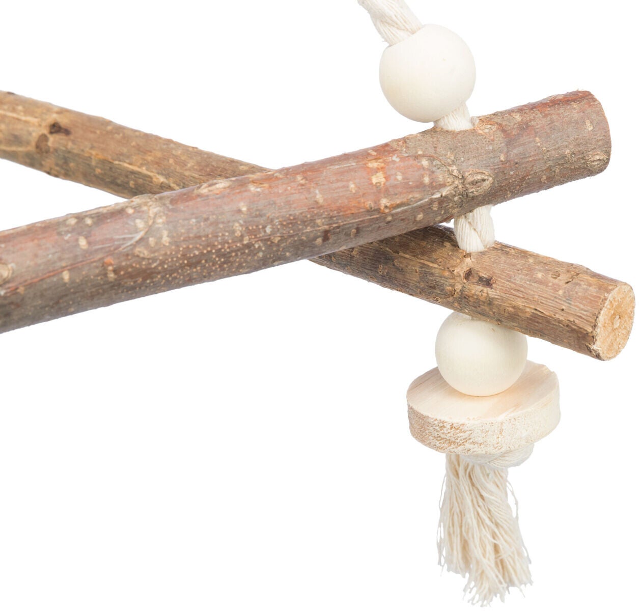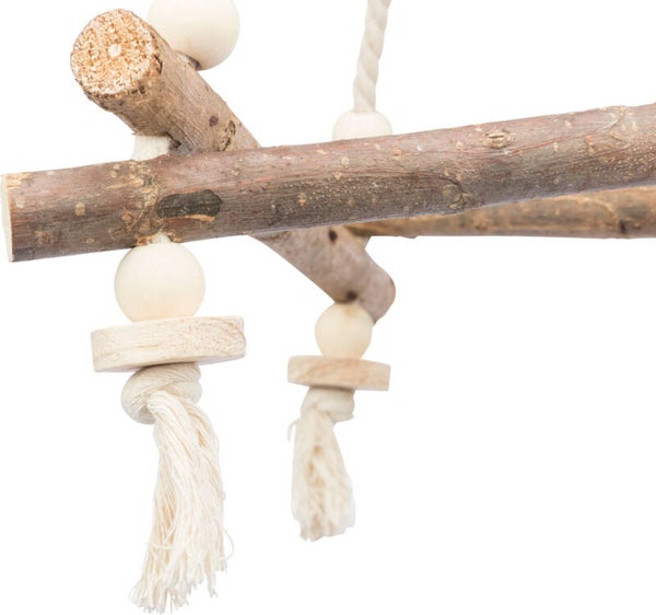 De Trixie Schommel Aan Hout Schorshout 27 x 27 x 27 cm vogelspeelgoed is een vogelschommel voor parkieten, dwergpapegaaien, van natuurlijk schorshout. Vogels als grasparkieten, valkparkieten en dwergpapegaaien zullen gelijk gek van zijn deze leuke schommel! Deze schommel heeft een driehoekige vorm en is gemaakt van natuurlijk schorshout. Het voordeel van dit hout is dat het een natuurlijke structuur van verschillende diktes heeft, wat goed is voor de afslijting van de nagels en de spieren in de pootjes. Aan het touw kan lekker geknaagd en geplukt worden en ook met de kralen kan jouw vogel leuk spelen. Een leuk speeltje dat zowel voor meer zitruimte zorgt als voor de nodige afleiding!