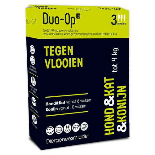 De vlooiendruppels van Duo-Op met de werkzame stof Imidacloprid beschermen jouw hond, kat of konijn snel en effectief tegen vlooien. Dit product heeft dezelfde werking als Bolfo Gold.