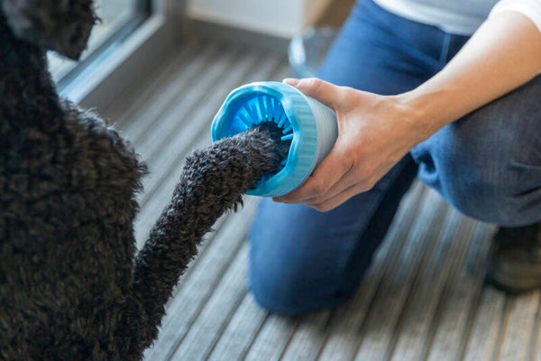 Zet de Poot cleaner gewoon bij de voordeur of vlakbij de ingang en laat jouw hond zijn poten achter elkaar in de zachte siliconen borstel dompelen. Draai de reiniger zachtjes heen en weer terwijl de borstelharen vuil en resten losmaken.