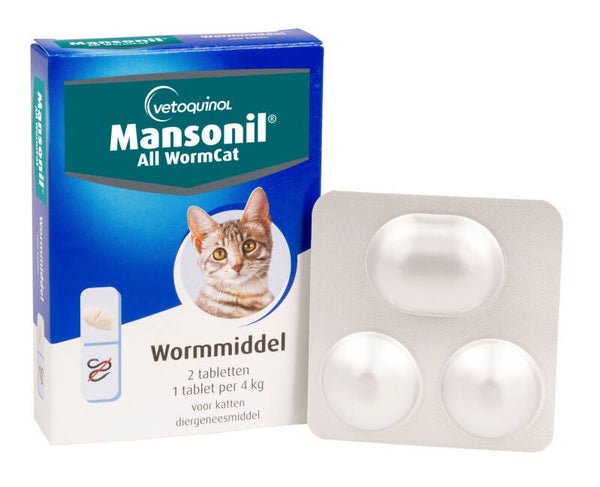 Mansonil All Worm Kat is een breedwerkend middel dat is ontwikkeld tegen meest voorkomende soorten wormen. Het doodt de meest belangrijke rond- en lintwormen die de spijsvertering van je kat in de war kunnen brengen en gewichtsverlies en gezondheidsproblemen kunnen veroorzaken.