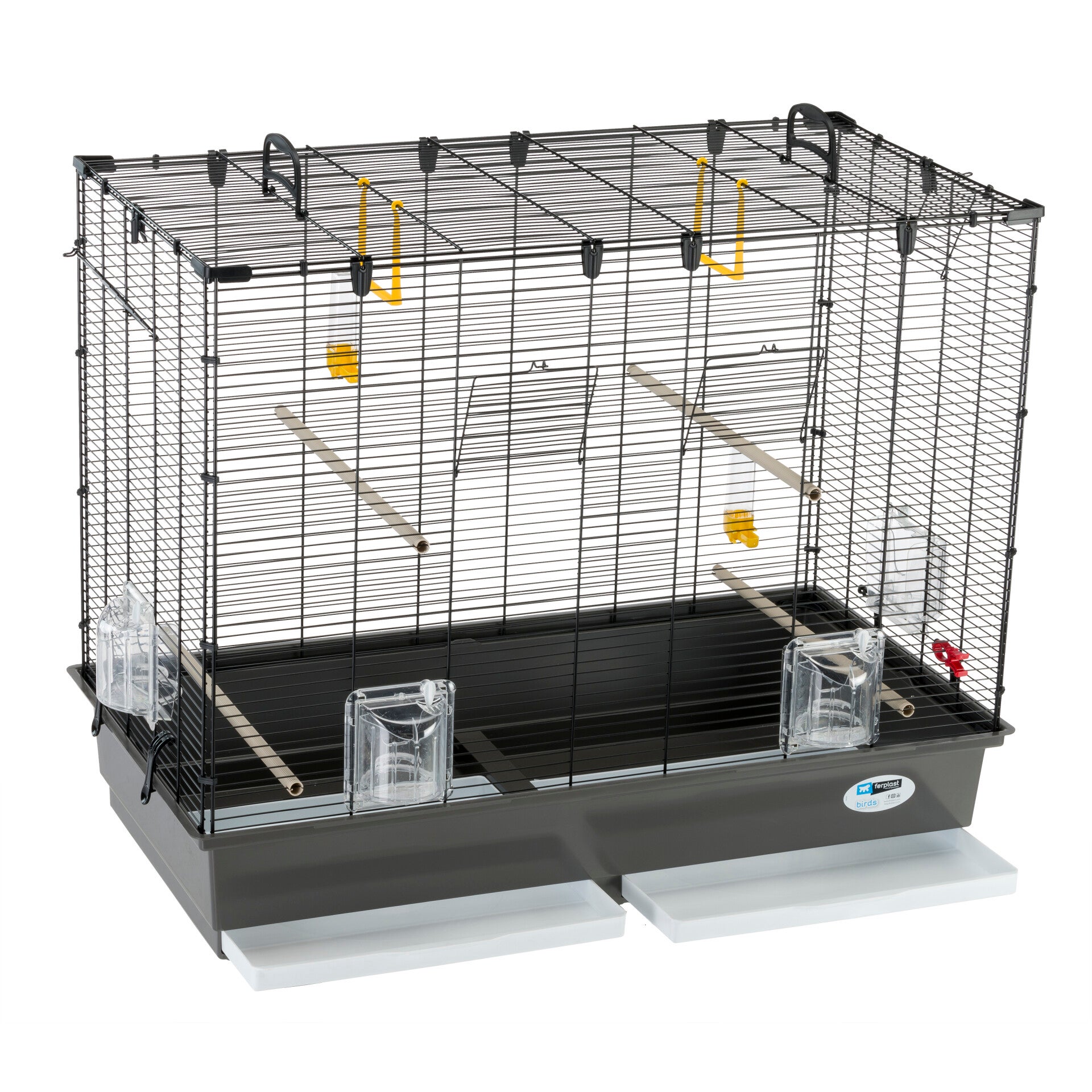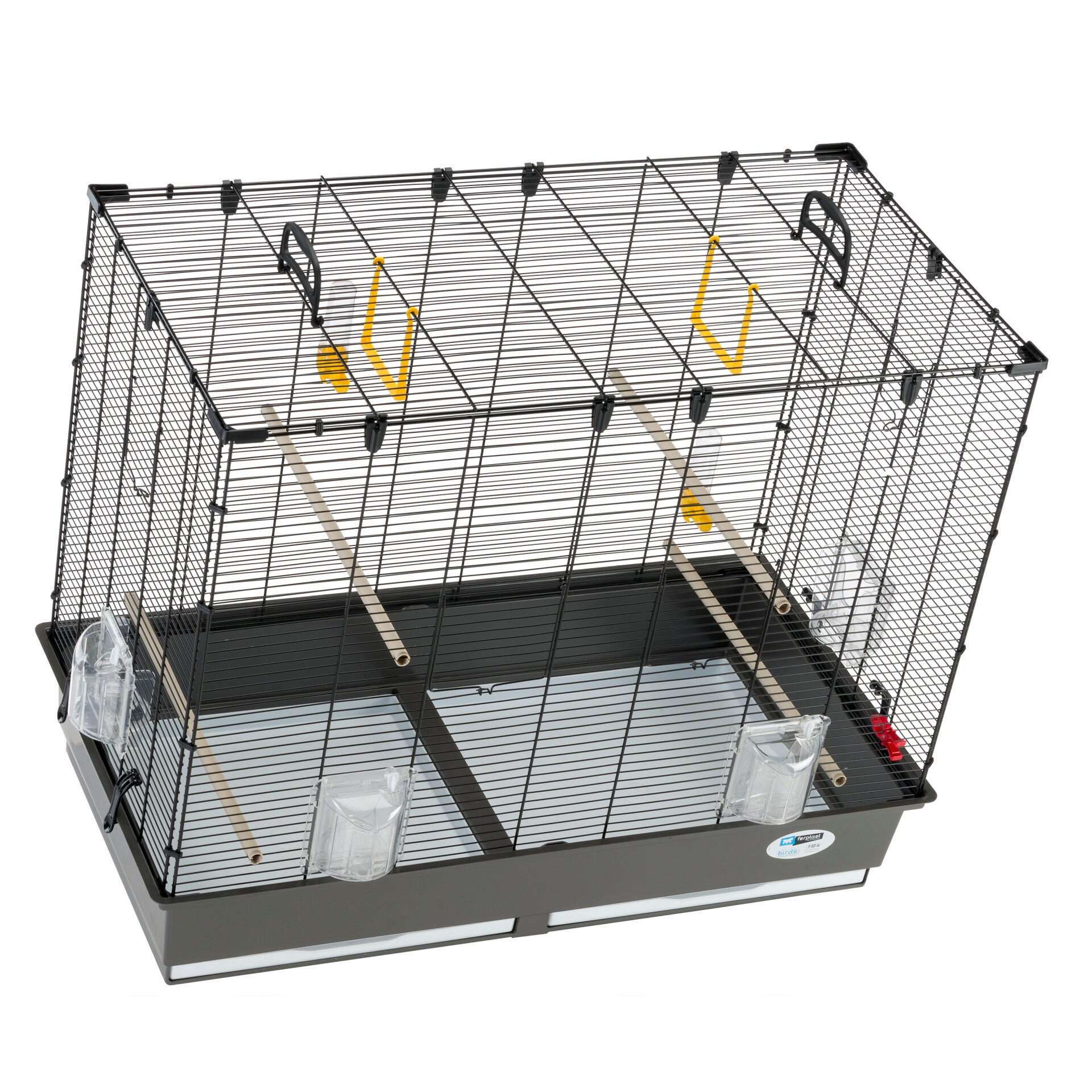 Comfortabele handgrepen op het dak zorgen voor gemakkelijke verplaatsing. Hij is ook uitgerust met een grote kunststof bodem met twee uitneembare lades voor eenvoudige en snelle reiniging. Meegeleverde accessoires: kunststof zitstokken, drinkflessen, groenteklem.