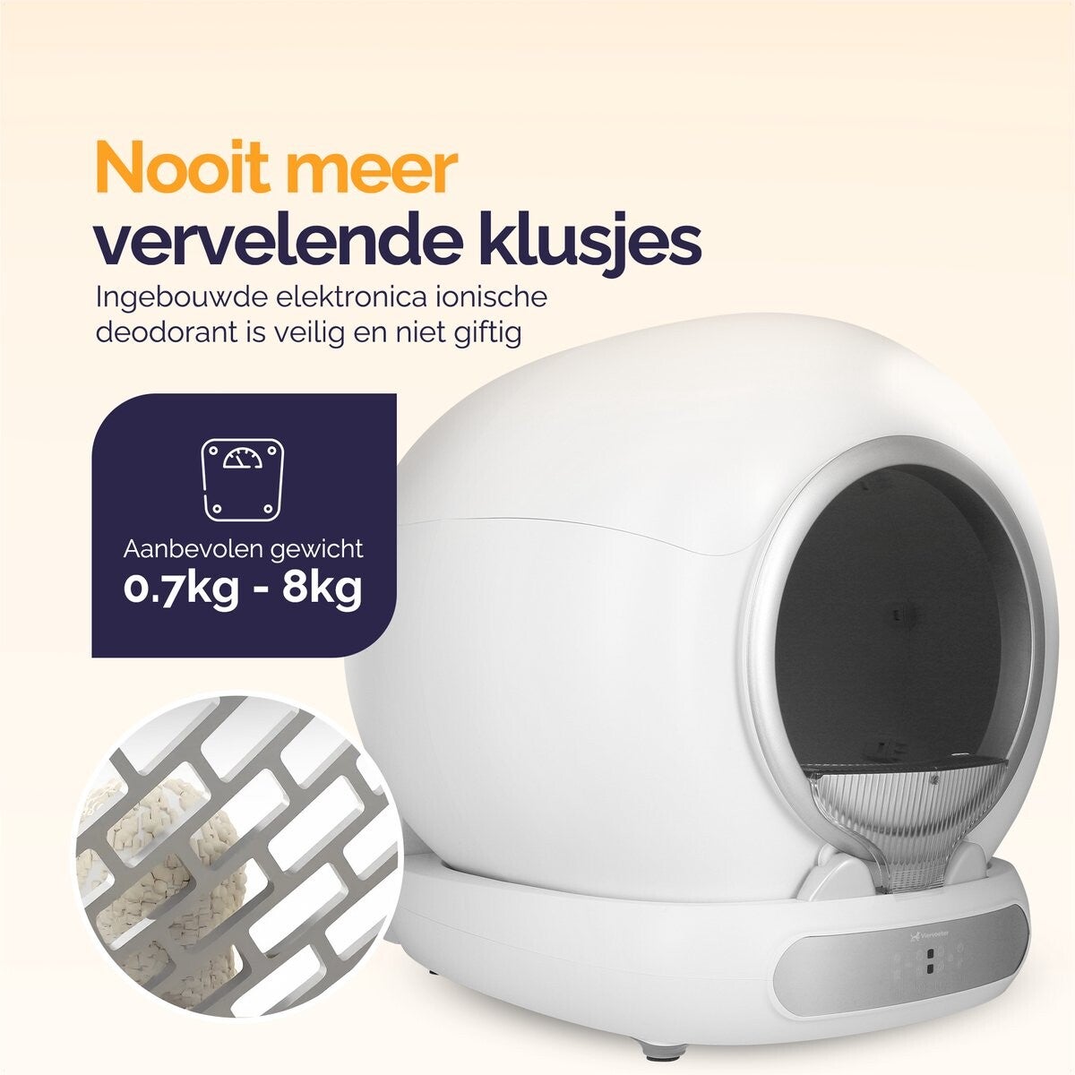 Zo reinigt het zichzelf automatisch, heeft het een ioniserende luchtfilter waardoor vervelende geurtjes geen kans krijgen en is het bedienbaar via de app. Zoals je kunt lezen is de automatische kattenbak makkelijk in gebruik en draagt het bij aan een makkelijker, schoner en fijner leven. Voor zowel baasje als huisdier. Benieuwd naar de verdere voordelen?