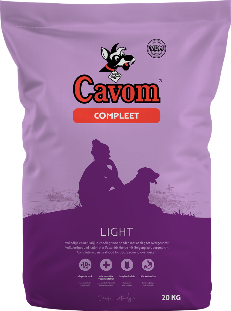 Cavom compleet light heeft een verlaagd vetgehalte, met rundvet diverse oliën en dierlijke eiwitten met rund en schapenvlees en plantaardige eiwitten. Cavom compleet light heeft calorie-armere koolhydraten zonder dat de voedingswaarde verminderd wordt. Cavom compleet light bevat diverse aangepaste grondstoffen waardoor het voer optimaal is samengetseld voor honden die aanleg hebben tot overgewicht.