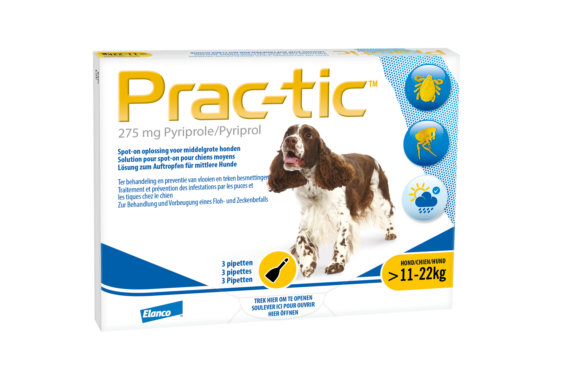 Prac-tic is minimaal gedurende 4 weken effectief tegen nieuwe vlooienbesmettingen. Prac-tic heeft een aanhoudende effectiviteit tegen teken gedurende 4 weken.