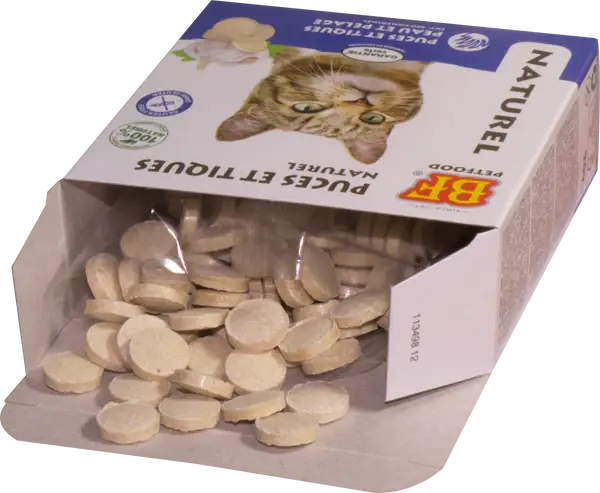 BF® smaakvolle en natuurlijke koud geperste knoflook tabletten met knoflook, aminozuren, vitaminen (A, B, D en E) en mineralen. Natuurlijk en effectief. Met de natuurlijke werking van knoflook. Allicine uit knoflook, is een natuurlijk ingrediënt in dierverzorging. Premium product zonder chemische toevoegingen. Ondersteunt afweer, huid, vacht (o.a. haaruitval) en darmflora. Glutenvrij recept. (Bier)gist bevat naast vitamine B(-complex) en vitamine D ook hoogwaardige en gezonde aminozuren, mineralen, eiwitten en enzymen. Optimale werking bij dagelijks gebruik. Voor alle kattenrassen, van kitten (vanaf 20 weken) tot senior.