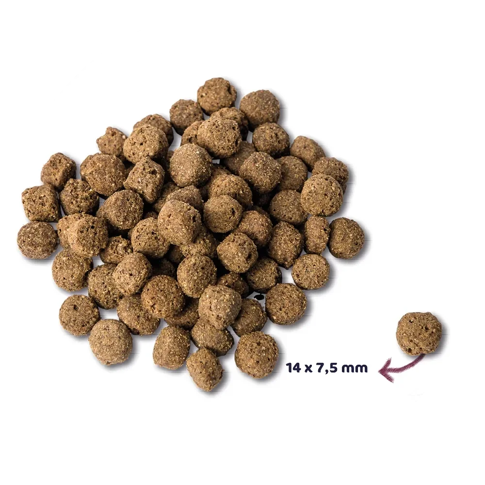 Ruw eiwit 23%, ruw vet 12%, ruwe celstof 3,5%, ruwe as 7,5%, vocht 9%, omega-3 vetzuren (bron van EPA/DHA/LNA) 1,51%, omega- 6 vetzuren 2,81%, (ratio ω3/ω6 = 1 / 1,9), calcium 1,2%, fosfor 1%.